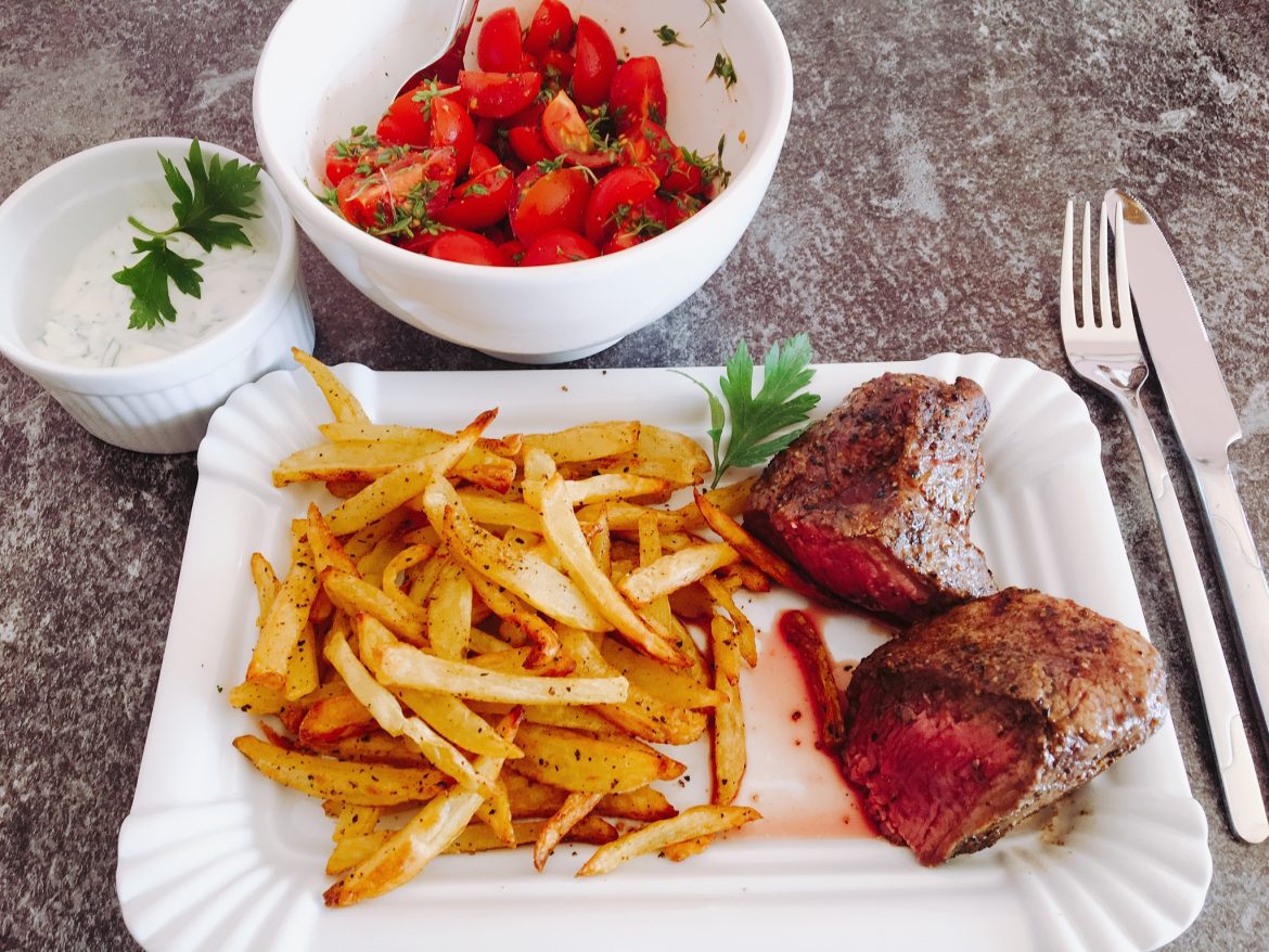 Ich habe meine Steak Frites genossen mit einem Tomaten-Kresse-Salat und einem Petersilien-Frischkäse-Dip. Köstlich für 15 Weight Watchers SmartPoints!
